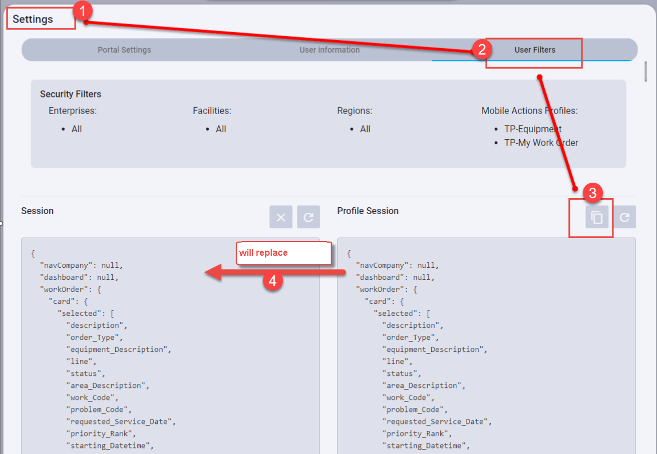 - In portal, go to Settings > User filters tab > click action button on profile session to replace user customizations with portal profile file customizations