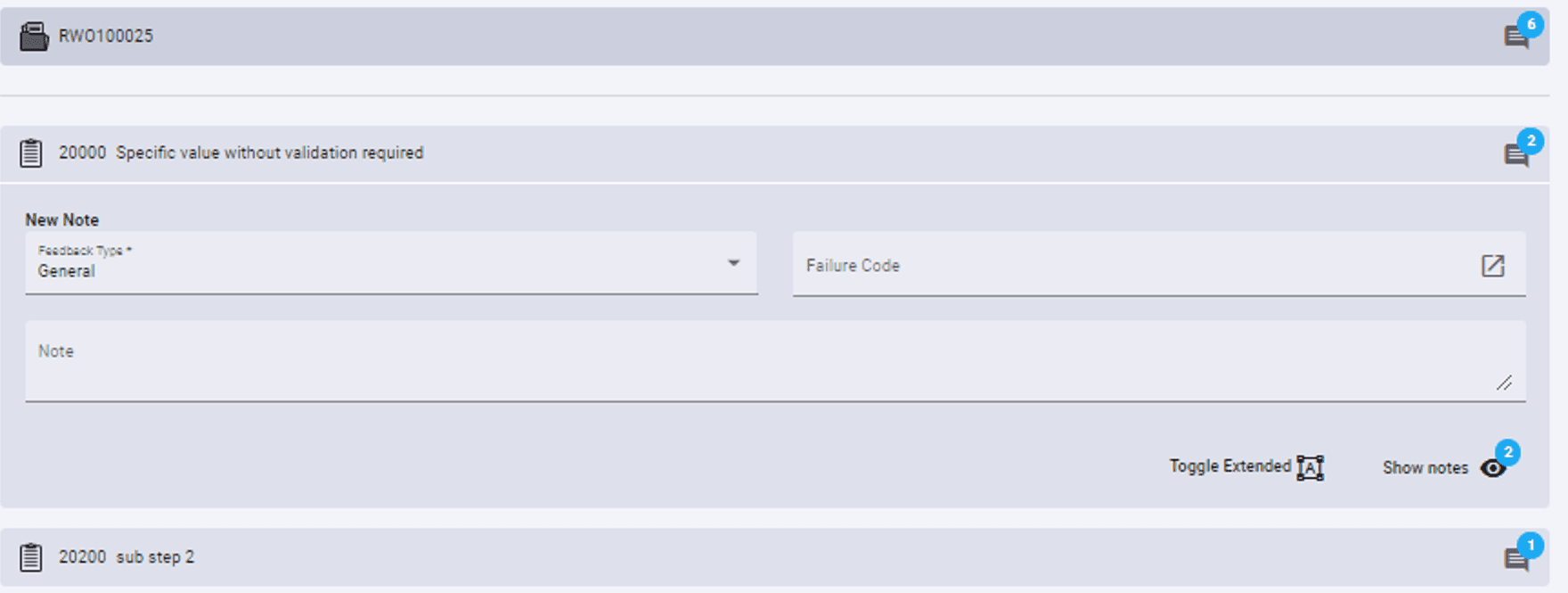 As soon as the user clicks on this step, the correct info card will also change to the Notes tab. The same grouping structure would be needed here: the notes related to the WO on top and notes against the lines.
