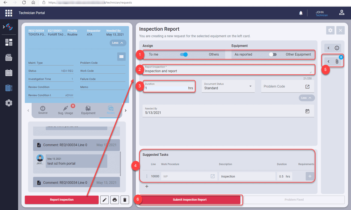 6 - Create a request. This button will be available only if the user has added all the required fields that contain the star, like needed by date and equipment ID.